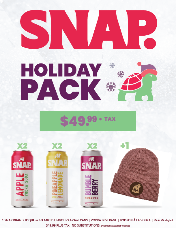 Introducing the Snap Holiday Pack featuring a delightful assortment of 6 Snap Vodka Soda Tall Cans & 1 branded knit weave toque.